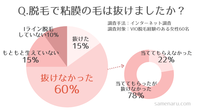 本サイトの独自アンケートによると、VIO脱毛経験者のうち60%の女性が粘膜の毛が抜けずに残っていると回答しました。